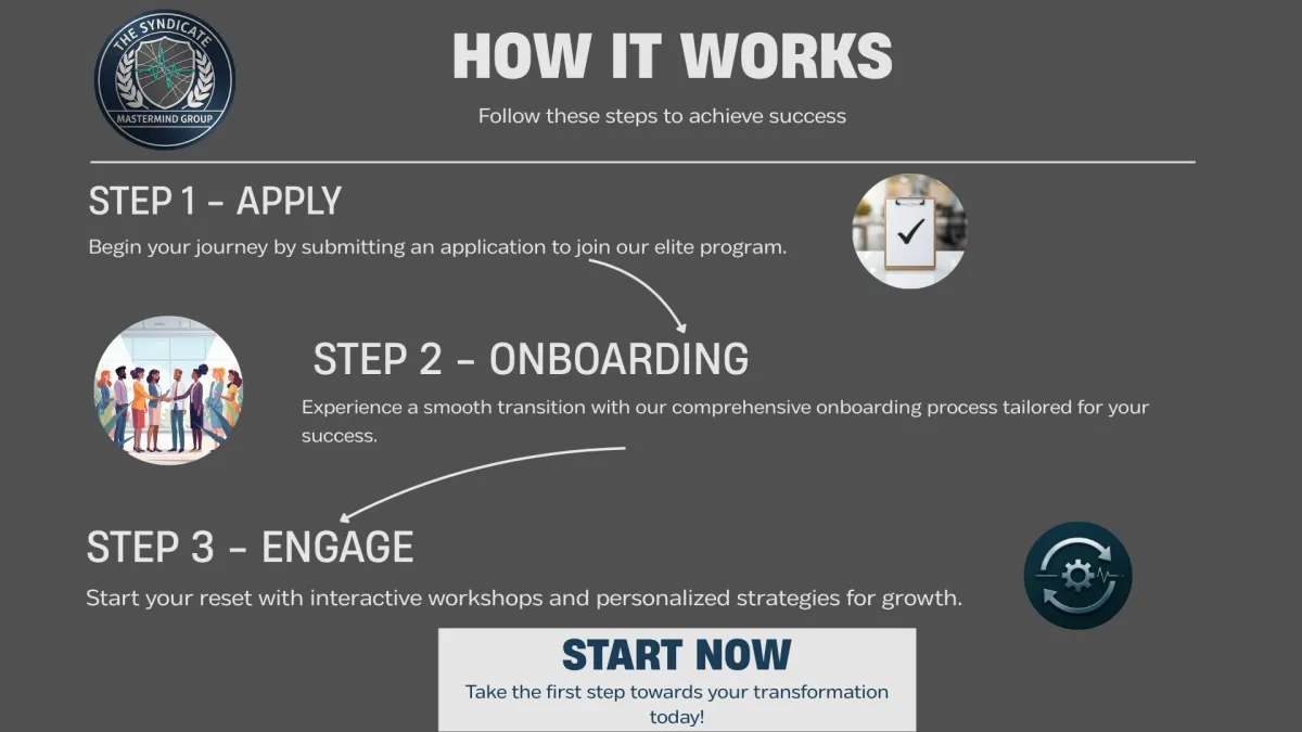 At The Syndicate Mastermind Group, every member gets access to our built-in board of directors, proven Reset Programs, and the Purpose Pulse framework.